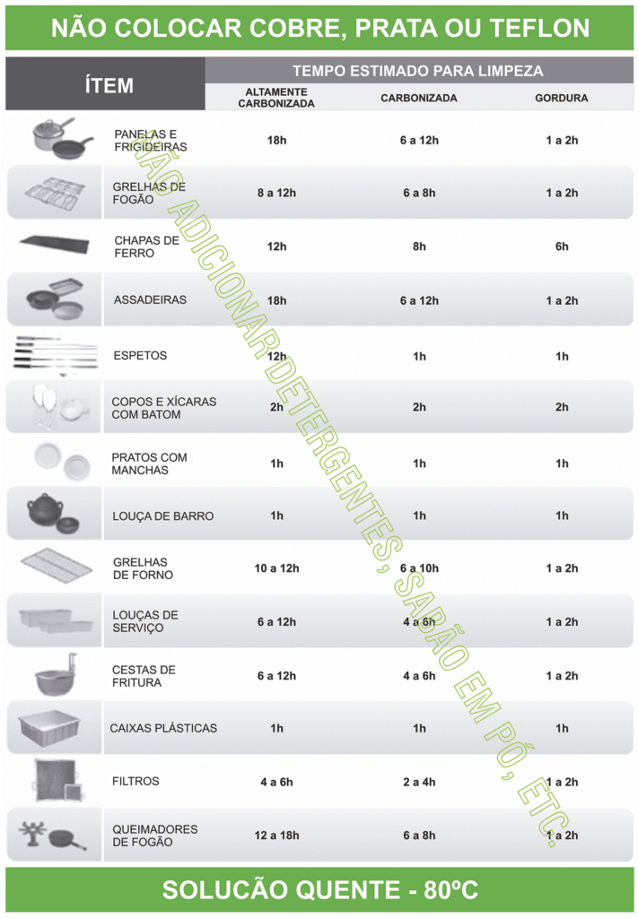 Não recomendamos colocar utensílios de cobre, esmaltados, plásticos finos, prata, silicone ou teflon. Tábuas de cortar e caixas plásticas podem ficar entre meia hora até uma hora no produto.